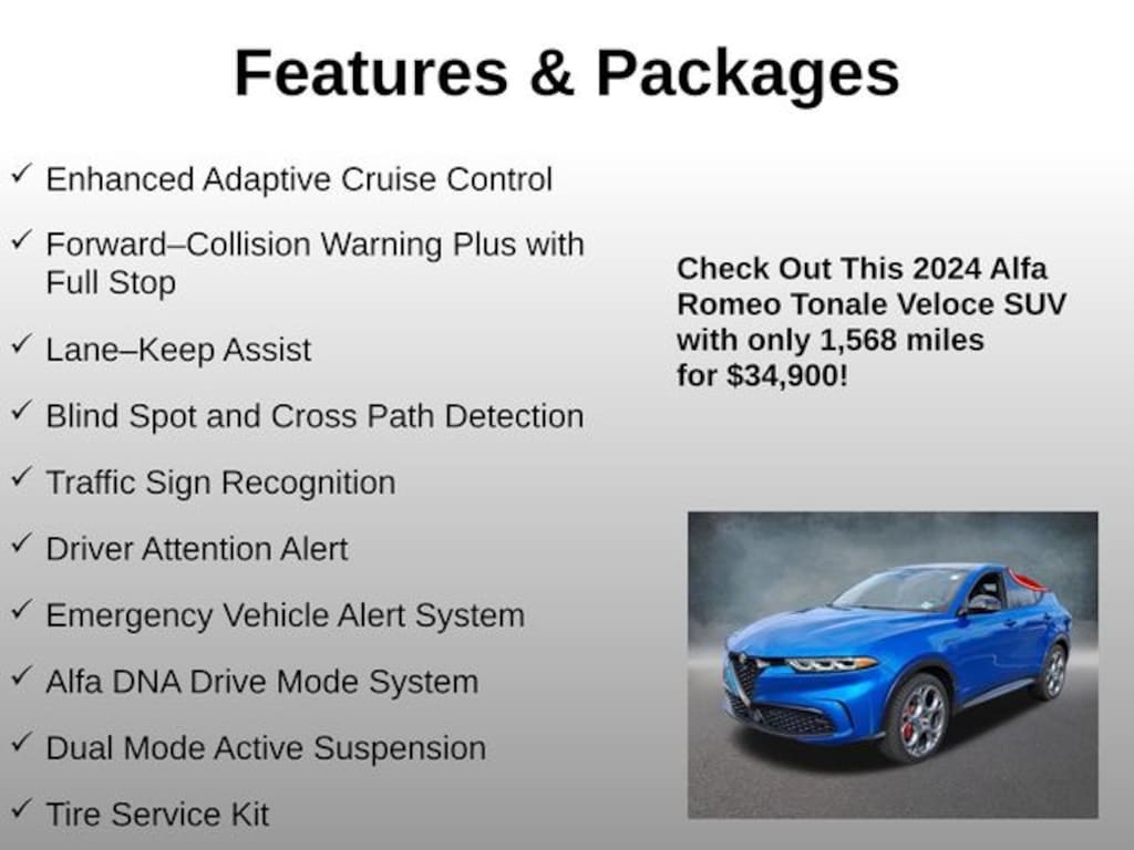 Enhanced Adaptive Cruise Control, Forwardâ"Collision Warning Plus with Full Stop, Laneâ"Keep Assist, Blind Spot and Cross Path Detection, Traffic Sign Recognition, Driver Attention Alert, Emergency Vehicle Alert System, Alfa DNA Drive Mode System, Dual Mode Active Suspension, Tire Service Kit, Cluster 12.3-Inch Full TFT Color Display, Wireless Charging Pad, 4-Way Power Lumbar Adjustable Driver Seat, 4-Way Power Lumbar Adjustable Front Passenger Seat, Configurable Ambient Lighting Package, Veloce Aluminum Door Sills, PHEV Exterior Badging, Gloss-Black Painted Mirror Caps, 235/45R19 All-Season Tires, Aluminum Padels, Gloss-Red Calipers with White Script, Dark Miron Painted Body Kit, Dual Chrome Exhaust Tips, 235/40R20 All-Season Tires, 1.3L I4, 14-speaker harman/kardon Premium Audio, 4-Wheel Disc Brakes, 6 Speakers, ABS brakes, Active Assist Package (DISC), Active Driving Assist System, Adaptive suspension, Air Conditioning, AM/FM radio: SiriusXM, Anti-whiplash front head restraints, Apple CarPlay/Android Auto, Auto High-beam Headlights, Auto-Dimming Rear Exterior Mirrors, Auto-dimming Rear-View mirror, Automatic temperature control, Brake assist, Bumpers: body-color, Compass, Delay-off headlights, Driver door bin, Driver Seat Memory, Driver vanity mirror, Dual front impact airbags, Dual front side impact airbags, Electronic Stability Control, Emergency communication system, Four wheel independent suspension, Front anti-roll bar, Front Bucket Seats, Front Center Armrest w/Storage, Front dual zone A/C, Front fog lights, Front reading lights, Fully automatic headlights, Garage door transmitter, Heated door mirrors, Heated front seats, Heated steering wheel, Illuminated entry, Knee airbag, Leather steering wheel, Low tire pressure warning, Manufacturer's Statement of Origin, Navigation System, Occupant sensing airbag, Outside temperature display, Overhead airbag, Overhead console, Panic alarm, ParkSense Front/Rear/Side Park Assist, ParkView Rear Back-Up Camera, Passenger door bin, Passenger vanity mirror, Perforated Alcantara Seats, Perforated Leather Seat, Power door mirrors, Power driver seat, Power Liftgate, Power Moonroof, Power passenger seat, Power steering, Power windows, Premium Interior & Sound Package, Quick Order Package 28E, Radio: Uconnect 5 Nav w/10.25" Display, Rain sensing wipers, Rear anti-roll bar, Rear seat center armrest, Rear window defroster, Rear window wiper, Remote keyless entry, Security system, Speed control, Split folding rear seat, Spoiler, Sport steering wheel, Steering wheel mounted audio controls, Surround View Camera System, Tachometer, TBD Axle Ratio, Telescoping steering wheel, Tilt steering wheel, Traction control, Trip computer, Turn signal indicator mirrors, Variably intermittent wipers, Ventilated Front Seats, Wheels: 19" x 8.0" Diamond Cut 5-Hole, Wheels: 20" x 8.0" Grigio 5-Hole. Odometer is 17943 miles below market average! Clean CARFAX.